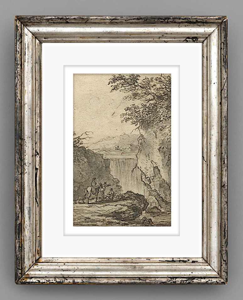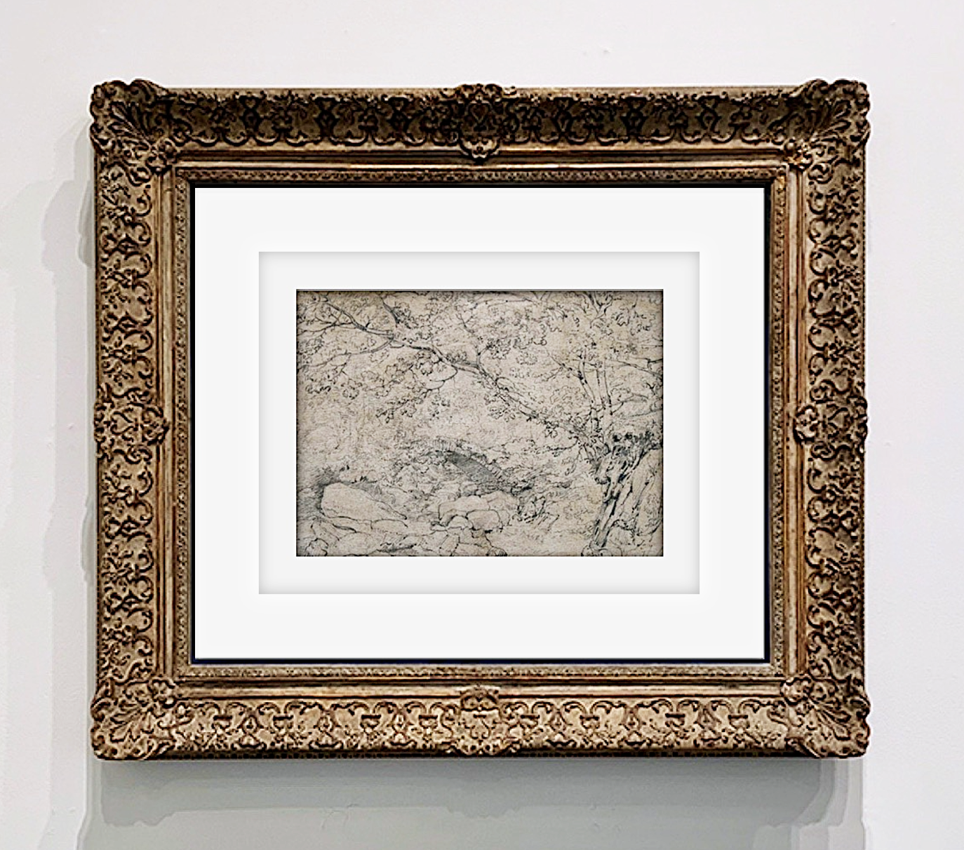 Beautifully executed large drawing in soft pencil, it is inside a rectangular border drawn by the artist. showing an old bridge around a number of trees in a hilly and rocky landscape. Thi...
