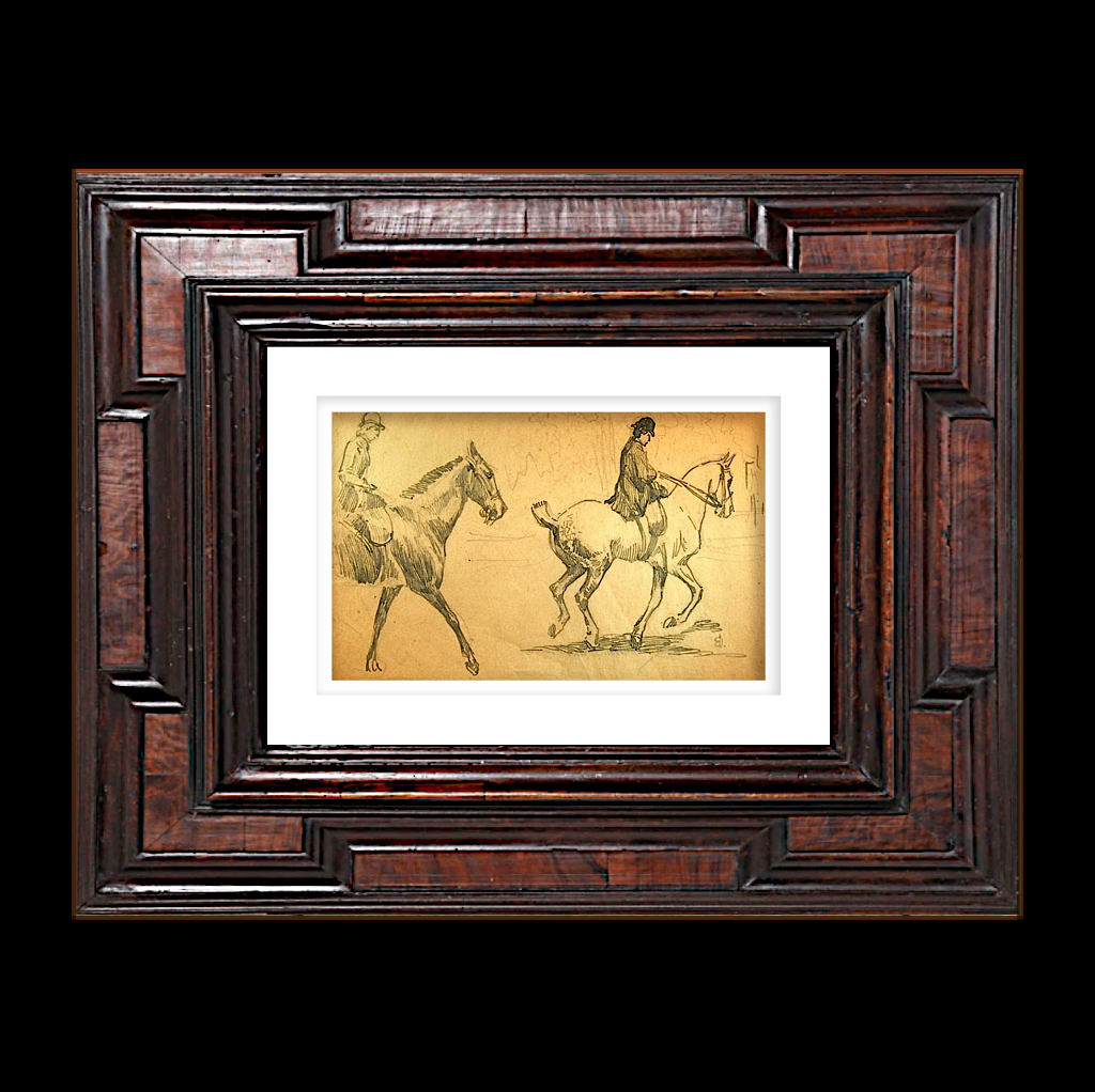 A little drawing of two horse riders, this is an original ink wash sketch: graphite on yellow paper. There are rich tones within the antique paper and delicate details in the natural life...
