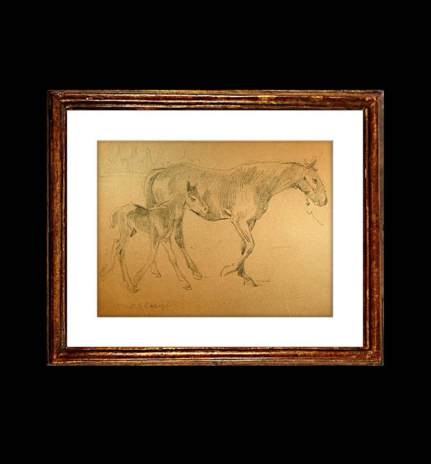 This original little antique equestrian graphite drawing depicts a mother's horse and her baby foal on yellow-brown paper. Over the course of eighty or ninety years, the paper has acquired b...