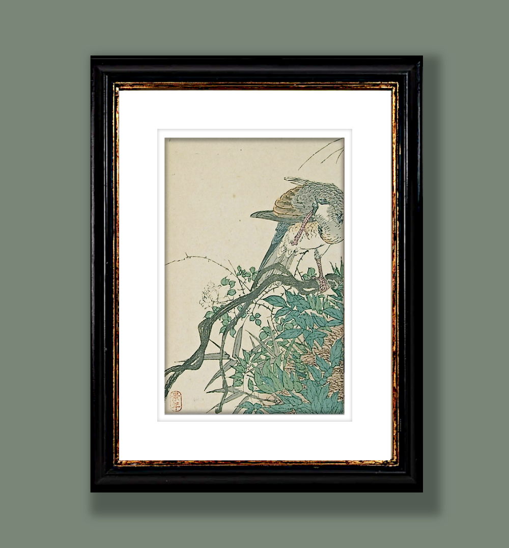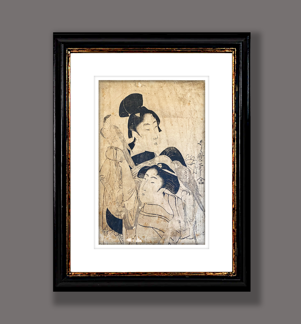 This is a rare 18th-19th-century Japanese woodblock print featuring birds of prey, samurai, and geisha women training their birds. The defined lines in this beautiful print are absolutely am...