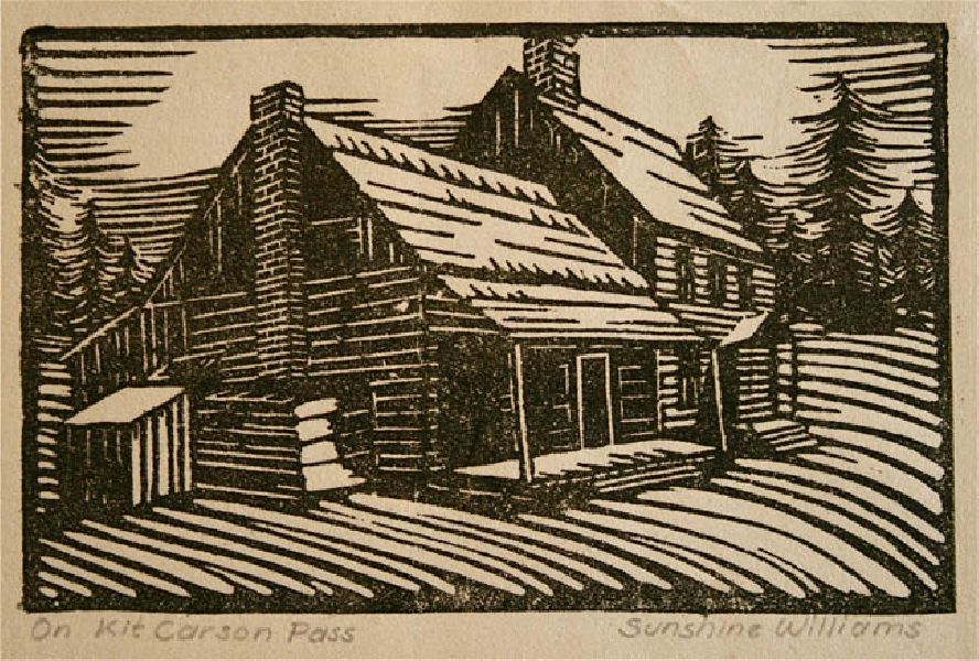 This is a beautiful little antique woodcut landscape printed on brown hand made paper of a mountain log cabin. On kit carson pass signed Sunshine Williams. This is a antique woodblock or w...