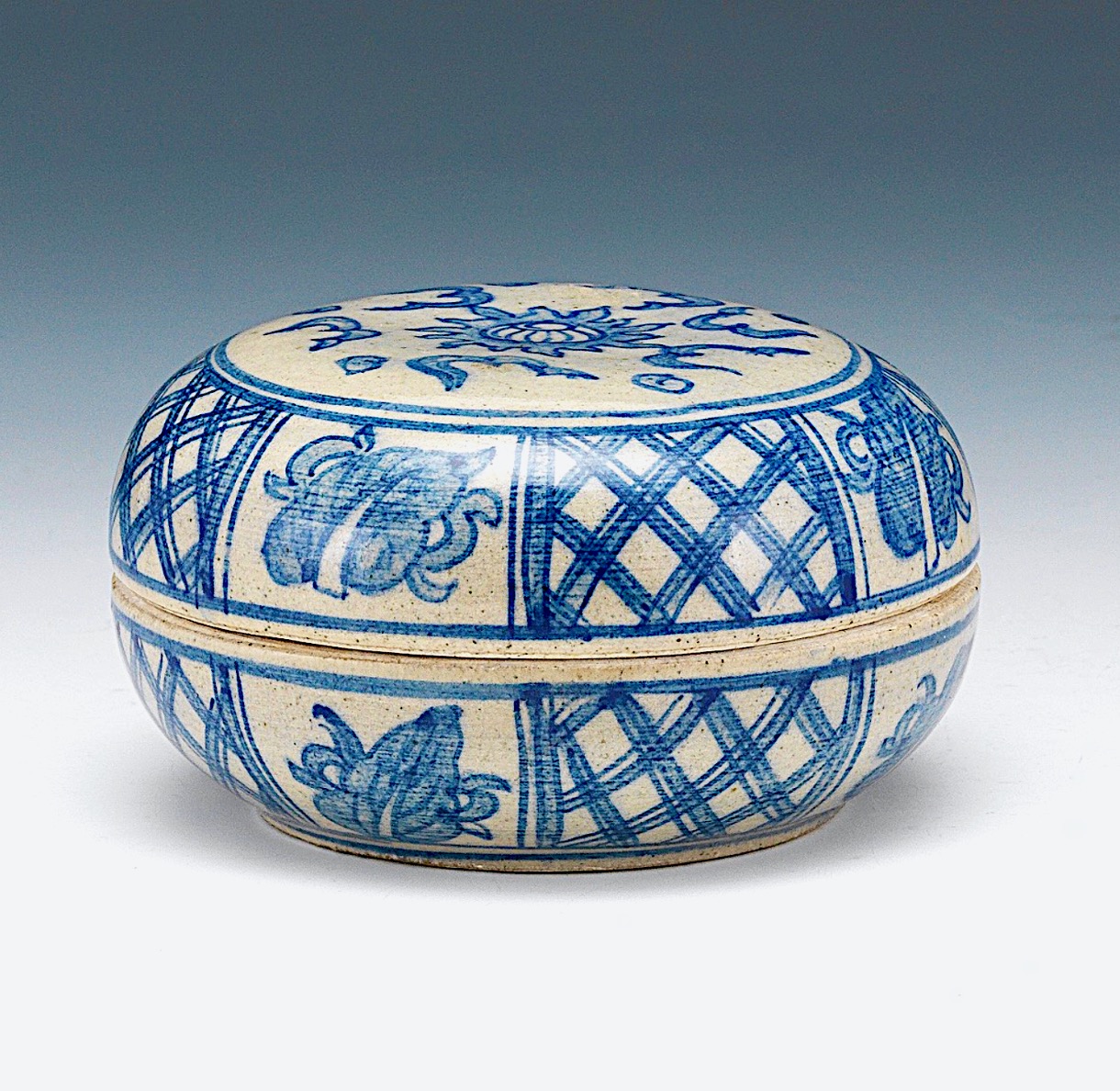 Chinese Porcelain Blue and White Seal Wax Ring Box with Lid 2 ½" x 4 ⅛" Of round form porcelain blue and white seal wax box with fitted dome lid, hand painted in underglaze blue...