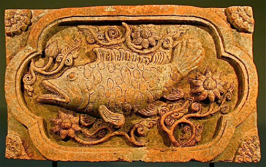 Lovely terra cotta panel with fish and floral motif on black base. The beautifully carved fish details make this a very nice decorative piece for your home.