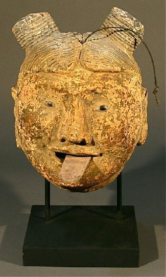 This is a Large Burmese marionette head clay ceramic and a wooden movable carved tongue.