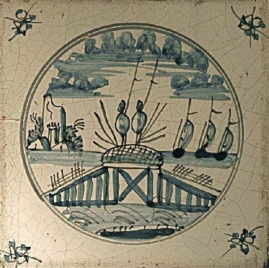 Art design decorative glazed painted blue tile made around 1650. Ship landscape tile. The period from 1650 to 1700