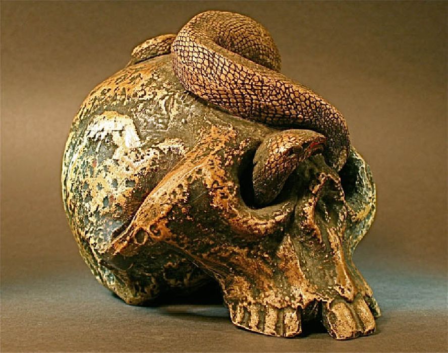 An amazing art grave sculpture. Life-Sized Japanese Skull and Snake: Used to decorate a temple in Taisho, Japan, this ceramic skull could have been made as late as the 1920s. One end of the...