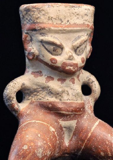 A striking Aztec-style ancient ceramic terracotta pottery ceremonial head fragment, hand-potted wit...
