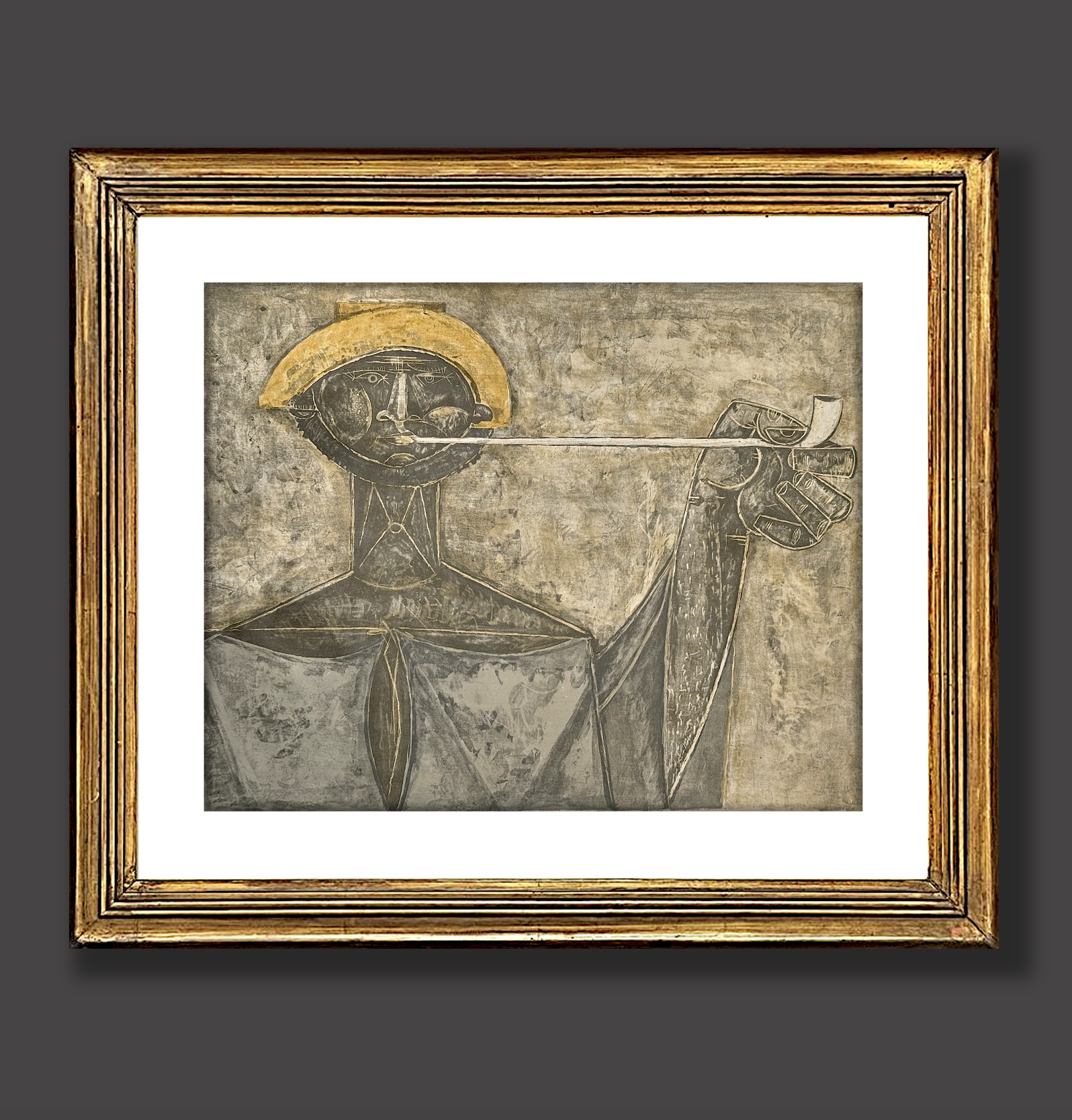 This post-war figure with a clay pipe is a work on paper that appears to be an original gouache painting, although the artist is unknown. The style is reminiscent of Picasso’s cubist appro...