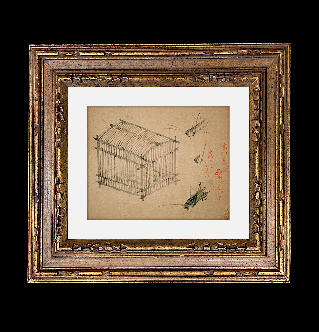 Original Ink Painting Two Leaping Japanese Crickets And Cage