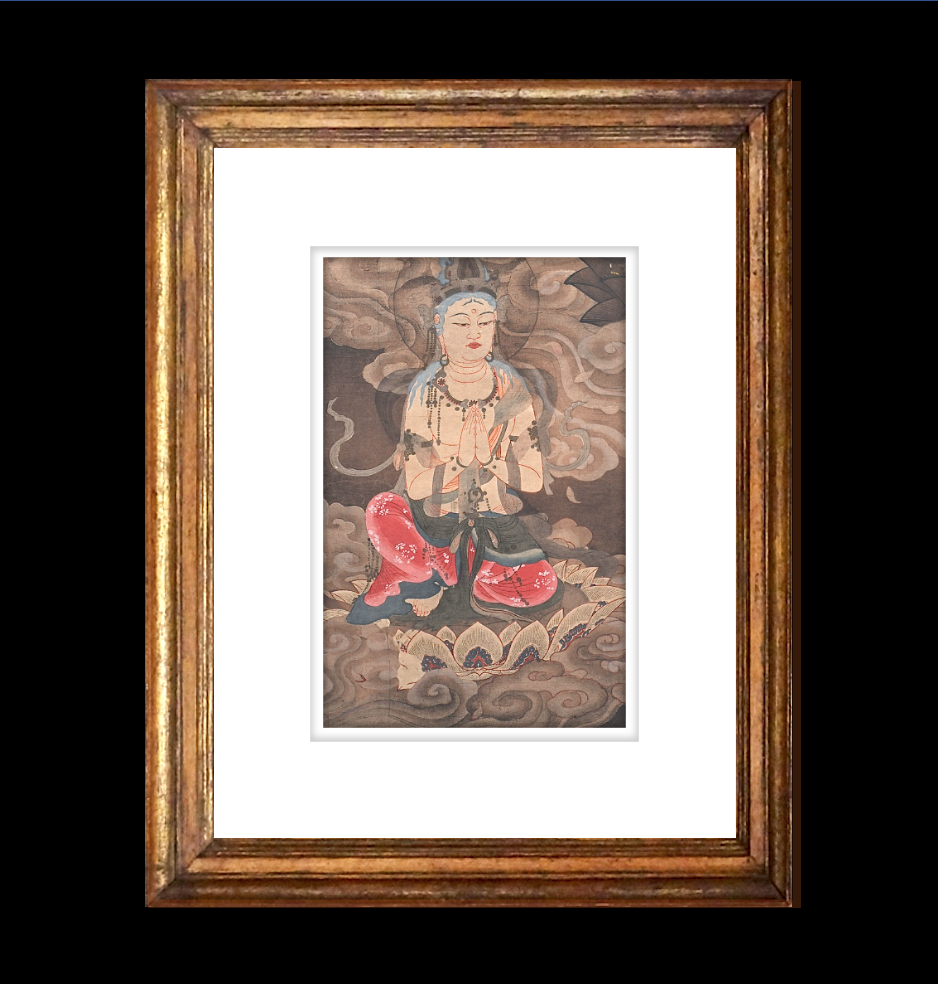 A Stunning Japanese Hand Painting Gouache of Kannon Seated on a Lotus: Antique gouache painting on paper depicting Kannon seated on a lotus among clouds; softly colored and with shades of r...