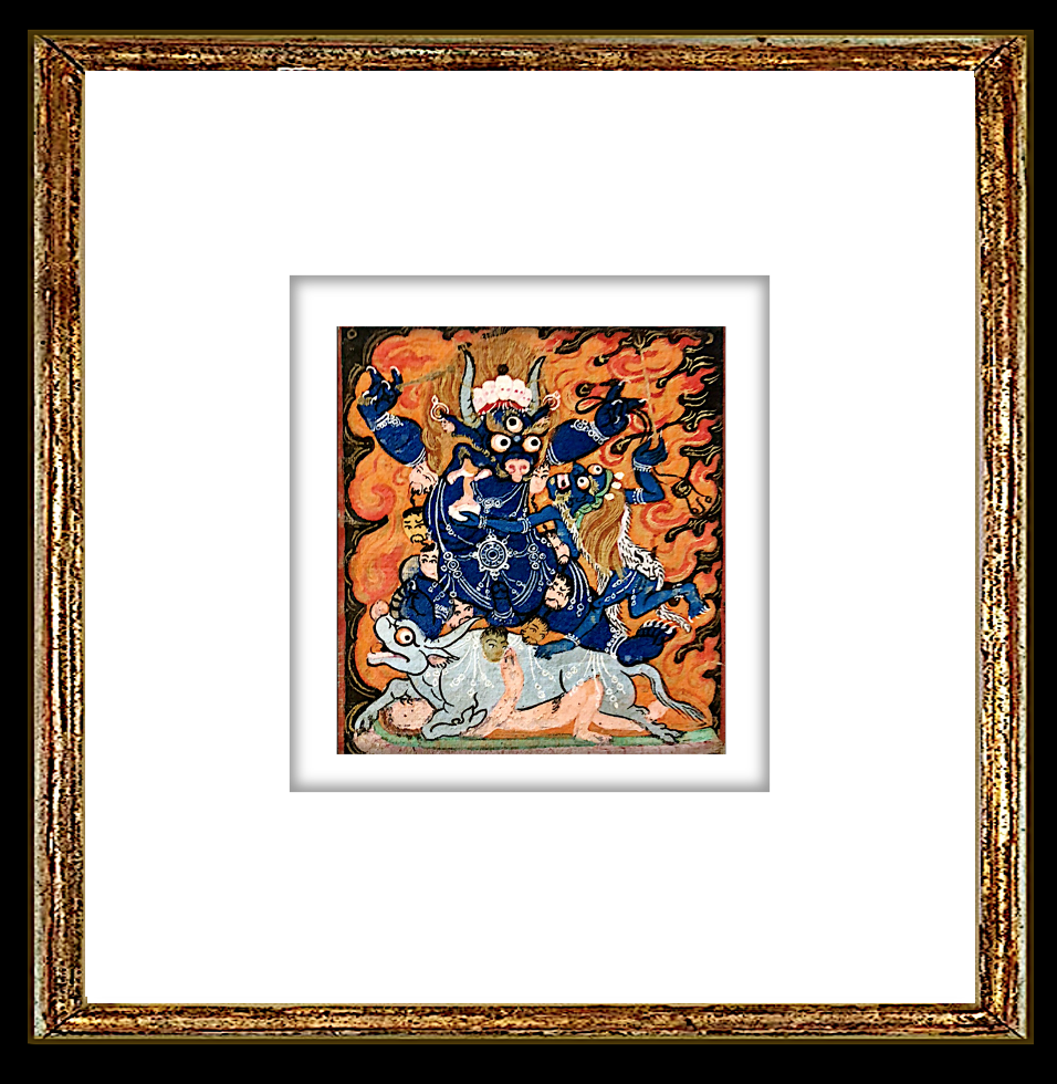 A spectacular little very old Mongolian painting. Painted on a fine Canvas textile. A Sexual spiritual demon watching over a man having sex with the bull. This painting is explicit and demon...