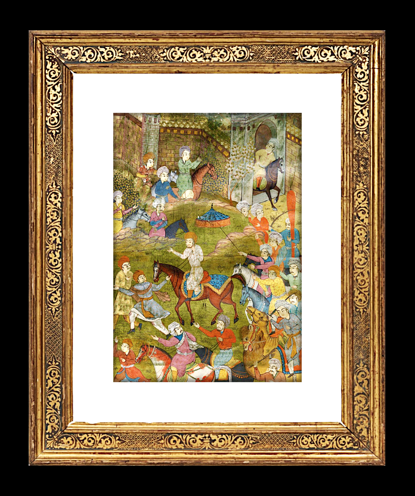 Illuminated Manuscript Page 13 ½" x 9 ½" Skillfully painted manuscript page depicting an equestrian scene, gouache on paper with gold pigments, surrounded by hand-lettered notati...