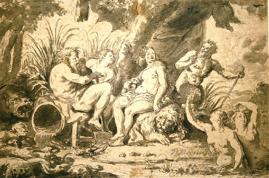 The sketch of nymphs and satyrs was made in black and grey wash. It is assumed to be the work of a studio assistant...
