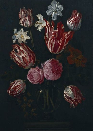 Still Life Painting By Christiaan Luycks (Belgian, 1623-1658): Floral Still Life. Oil on cradeled panel, signed with "KL" monogram at the lower center, in a wide Dutch style frame in black...