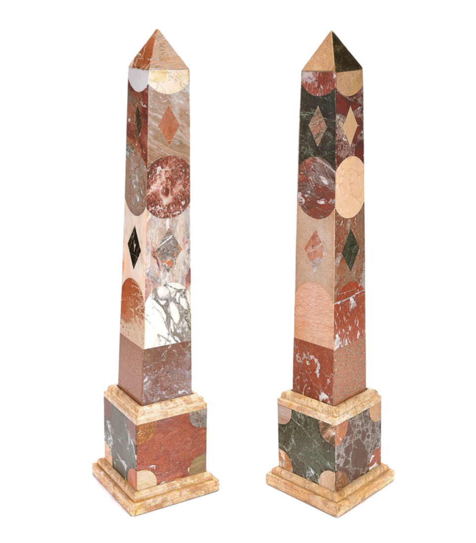 Italian Antique Inlaid Pietra Dura Colored Marble Obelisks