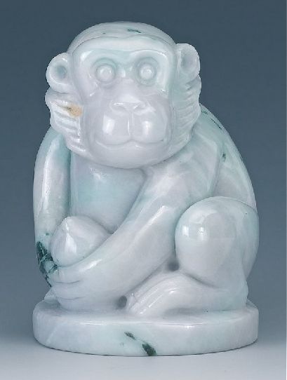 White & Green Carved Jadeite Seated Monkey Figure Holding Peach