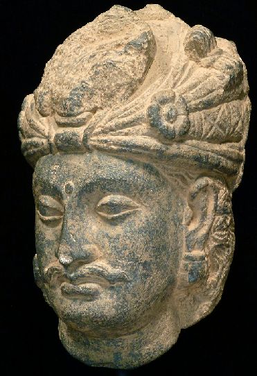 FINE HEAD OF A GANDHARA PRINCE. Gandhara, 1st-2nd century AD. 7.5 x 4.5 x 4 inches. Fine quality head of a Gandharan prince with mustache and turban. Excellent condition. On custom stand...