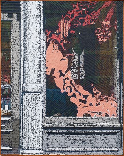 Soft City: Angelika by artist Marilyn Henrion. Digitally manipulated photography, inkjet printing on cotton, hand quilted. Anodized aluminum hanging bars included (invisible from front). ...
