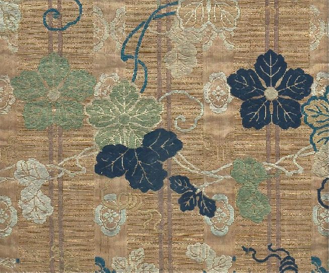 A Framed Japanese Antique Obi: 62½ x 14¾ inches. Brocade textile Obi framed under glass in a black painted frame overall 64 x 15-1/2 in. Silk and gold threads. Condition: Not inspected ...