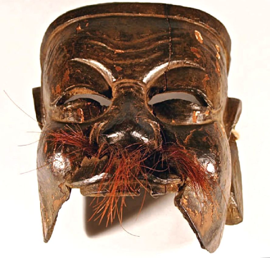 This mask of a man is unusually striking, due to the elaborate curled hair.