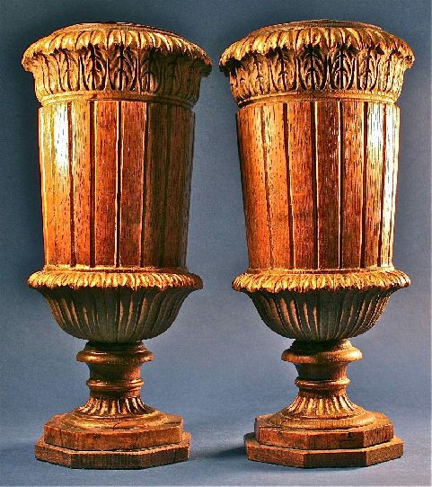 Early 19th Century Pair of hand carved Italian gilt wood fluted urns with classic antique swag and carved detailing. Gold painted finish. Perfect old planters for your every need in our ex...