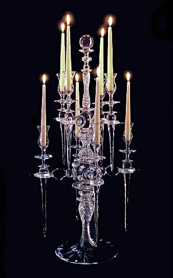 "Candelabra" blown, sculpted, assembled glass. 36"H/16"W/16"D. It takes 4 to 6 weeks to make, custom etching is available.