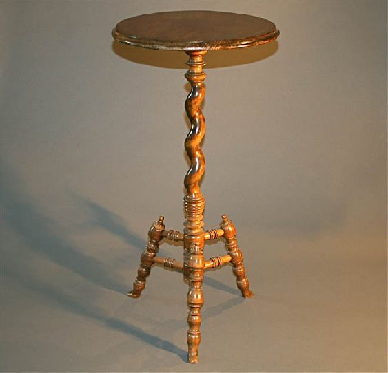 This collectible side table, carved in a highly complex design, dates from the late 19th or early 20th century. It has a single stand, and many wood-worked parts: circle capital, segmente...