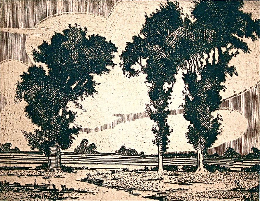 Metal engraving of a landscape with three large trees, some times called Etchings. Metal plate is a flat sheet of metal, usually copper...