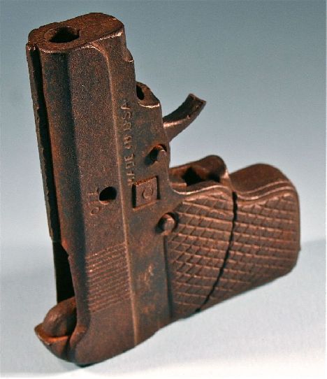 Mechanical cast iron cap pistol. It is in excellent condition with all of its original metal. It is marked Bunker Hill. Works Well. 1925...