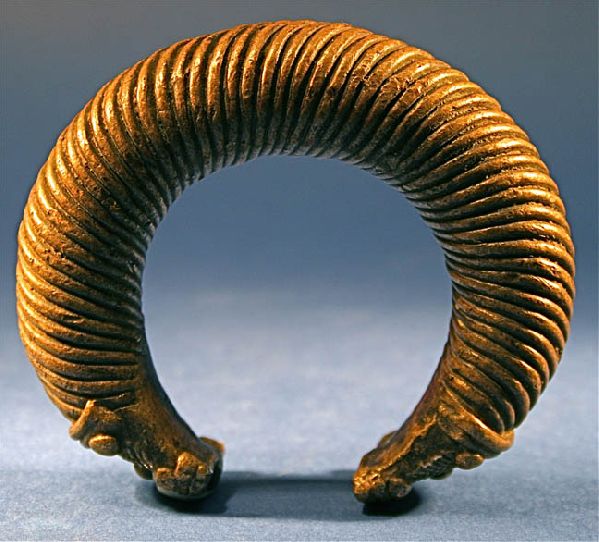 Worn around and over the horns of beasts of burden or livestock. These bronze bracelets are worn to cause the points of the horns to point ...