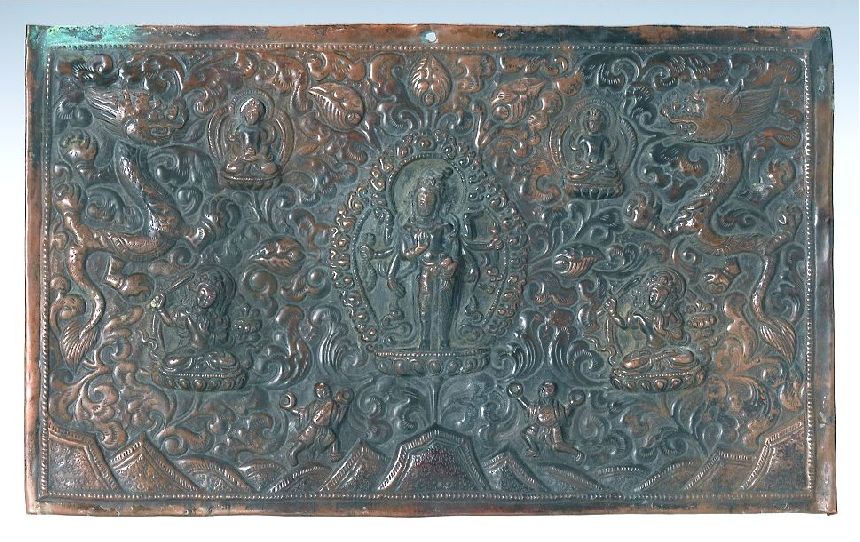A Tibetan Repousse Plaque, ca. 19th Century: 7" x 11-3/4" Detailed copper repousse plaque with Vairocana, Amitabha, Amoghasiddhi, Akshobya and Ratnasambhava, the five Dhyani Buddhas on fo...