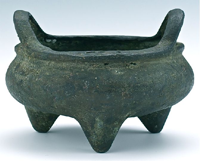 A Very Old Chinese Bronze Ding. Bronze ding with handles standing on lobed feet. Condition: As depicted. 3⅝ in. to handles x 5¼ in.