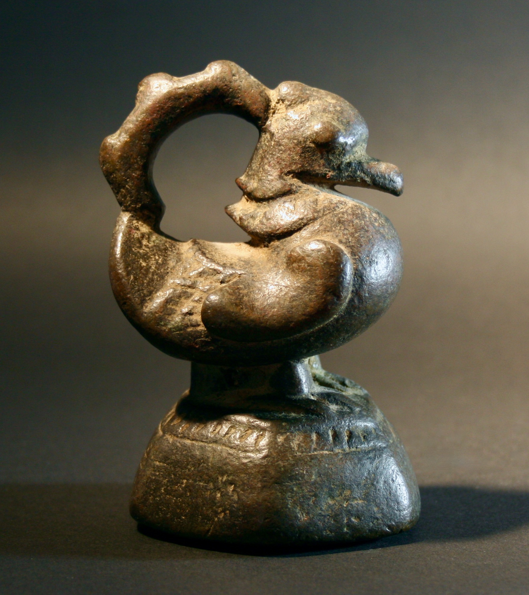 This is a truly remarkable 17th-century antique Tibetan bird duck opium weight, made of bronze. It stands at an impressive height of 4 3/8 inches and has a width of 3 inches. These ancient w...