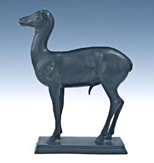 After Sabatino de Angelis (Italian, b.1838) "Fallow Deer". Bronze figurine after the antique Pompeian sculpture, attached to a rectangular bronze base with overall dark brown patina. Unsig...