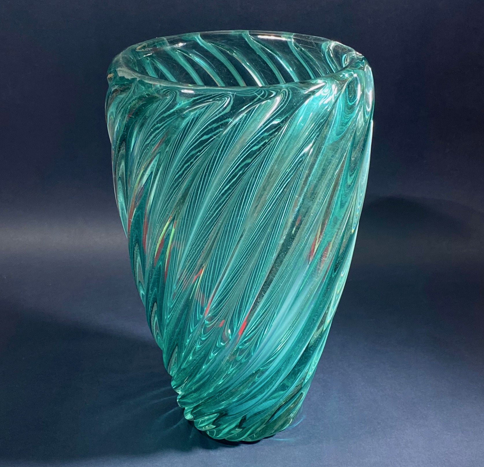 Highly collectible, rare opportunity / Vintage Venetian Italian Glass Artist Carlo Scarpa - Venini / ‘Mezza Diamante’ size 12 inches tall / Hand signed. Green Clear Spiraling Cane Sculp...