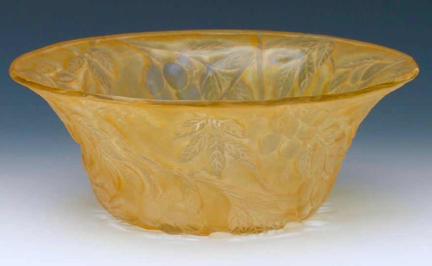 Cast and frosted yellow glass bowl depicting batched with fruits and foliage, smooth polished interior. No marks found.
