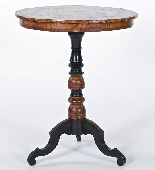 A Authentic Continental Marquetry Inlaid Game Table, ca. 1900. 28 x 23½ in. Variety of woods, marquetry work with chess top on round table, having low profile and on pedestal base with t...