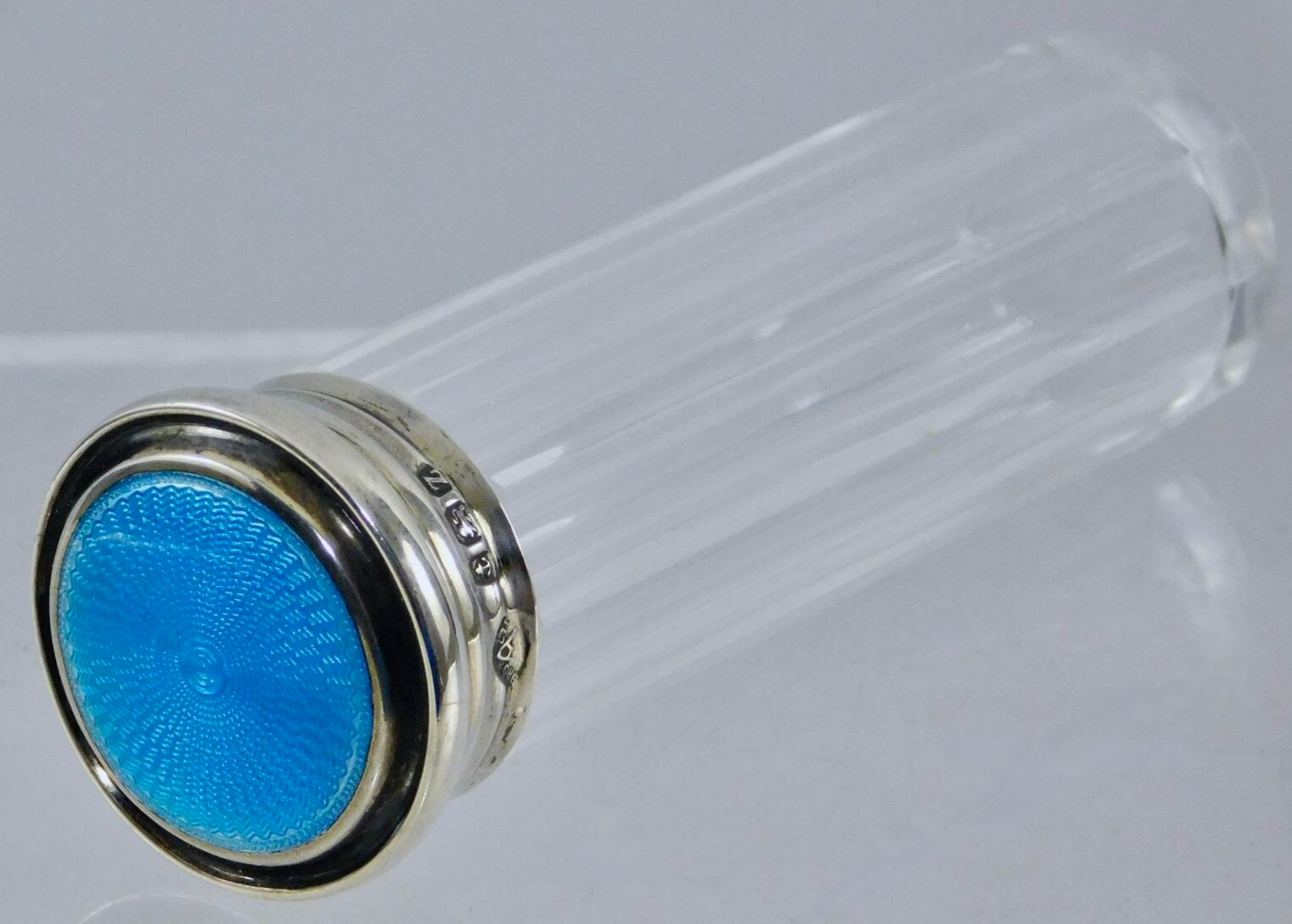 Beautiful Crystal & Sterling Vanity Bottle Blue Guilloche Enamel Lid. Fabulous antique tube bottle is made in English of 10 sided crystal.The lid is made of sterling silver, the top of t...
