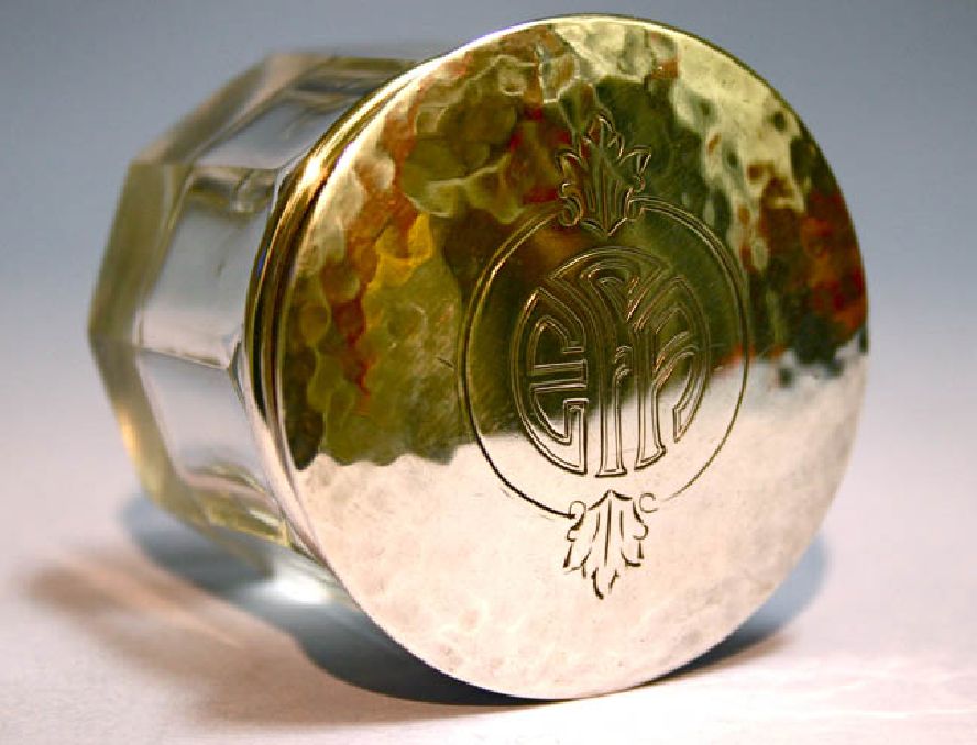 This Antique cut glass sterling silver jar. The leaded cut glass body is in excellent condition. There is a beautiful hammer...