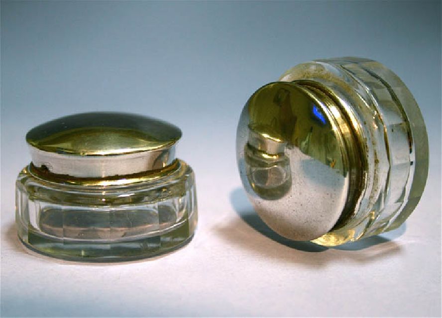 These are two antique cut glass sterling silver jars. The leaded cut glass bodies are in excellent condition. Two beautiful top sterlin...