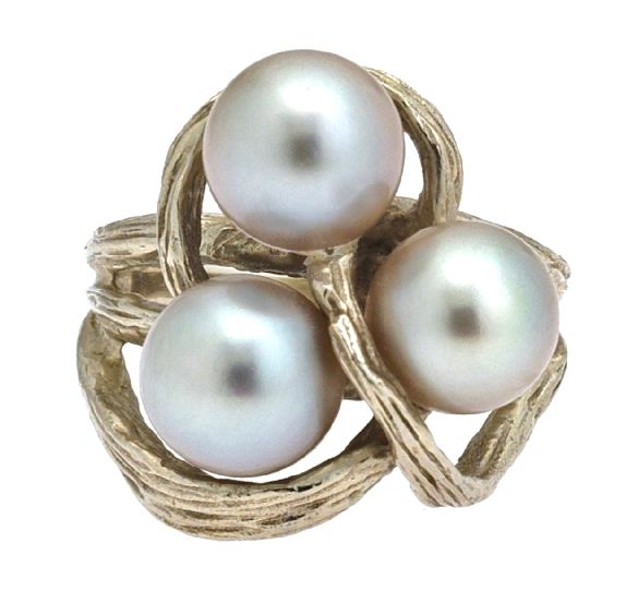 Ladies' Gold and Pearl Free-Form Ring Ring size 5.5 14k white gold openwork organic design free-form ring with a textured finish, set with three silver pearls, measuring 7 mm each; marked on...