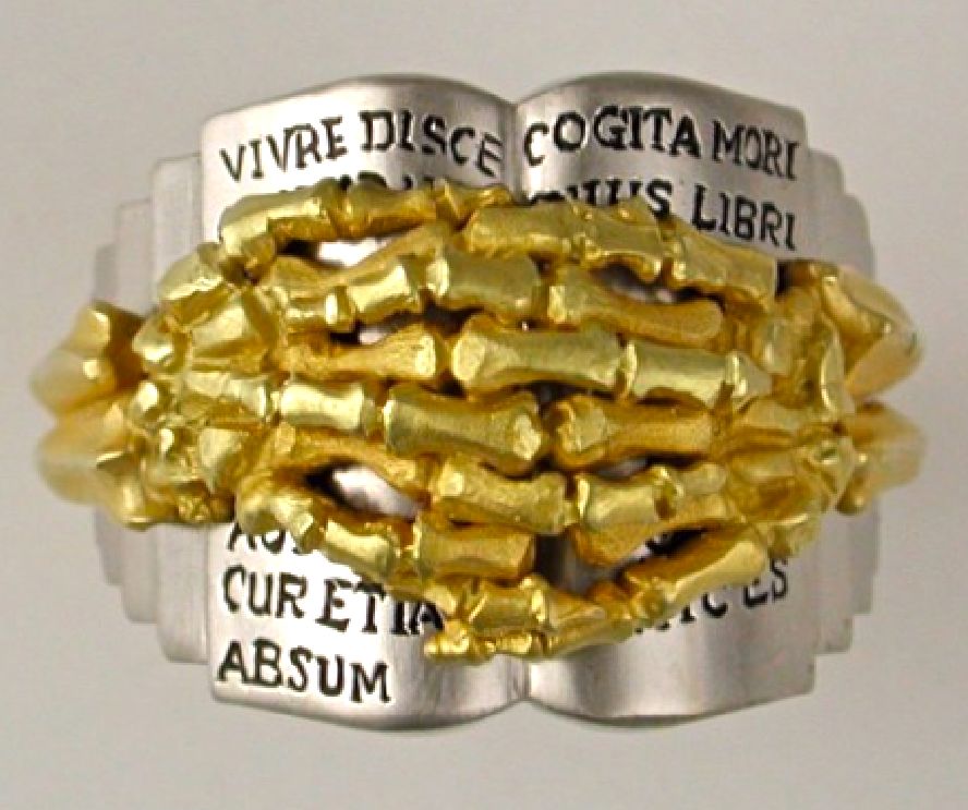 A unique Gentleman's 'Memento Mori' ring in 18 karat yellow gold and Palladium (Platinum family). The skeletal arms and hands encircle an open book which has upon the open pages ...