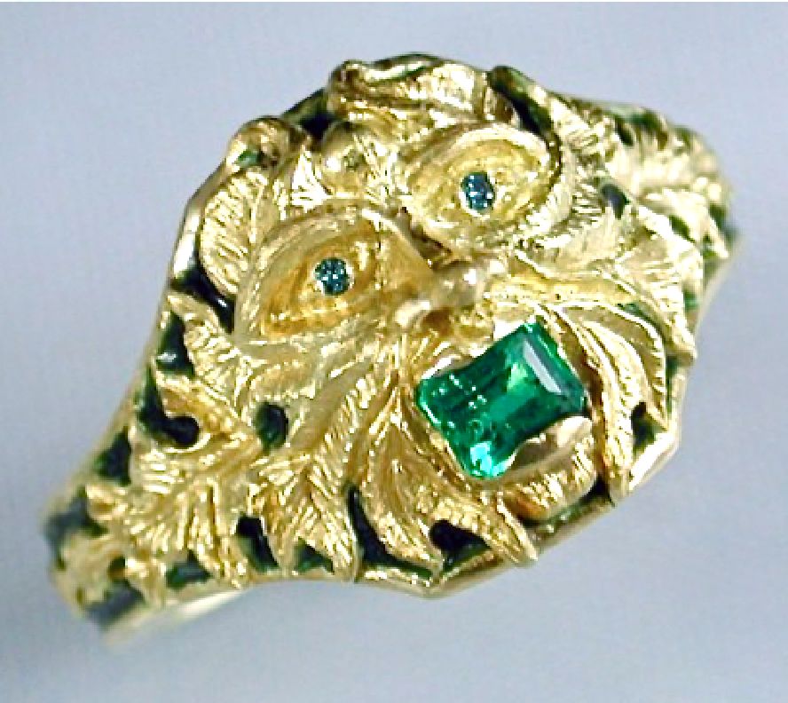 A dramatic, delicately carved, and hand-chased Gentleman's Gargoyle ring, fabricated in an antique, satin-finished 18 karat green gold which is highlighted by an inlaid frame of hand...