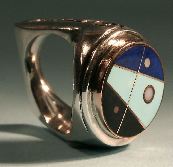 This Is A Spectacular Ring Sculpture By Jewelry Designer Daniel Macchiarini: This ring is made with turquoise, lapis and black jade; the Dots in all of these are marble with a copper i...