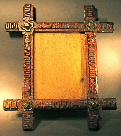 This is a very nice wooden geometric design folk art frame with unusual carving highlighting the carved folk look around the outside and it has four little metal buttons. This frame has laye...