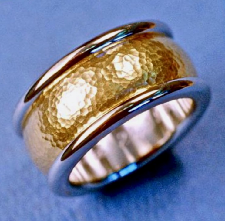 Spectacular custom designer Ring. Platinum Wedding band with an overlaid center of hand-hammered 22-karat gold. Designed and created by Artist Kim Eric Lilot.