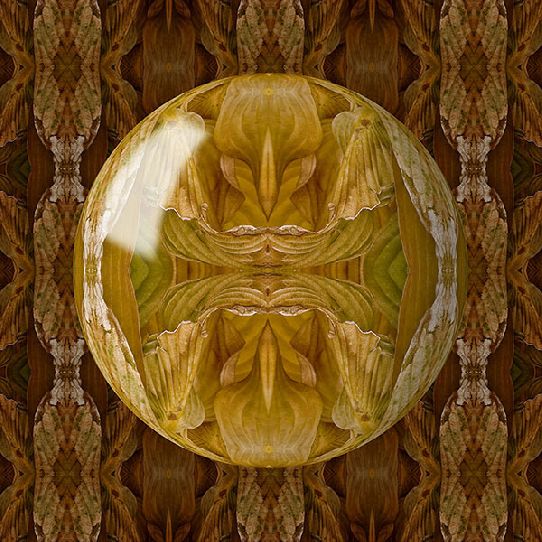 An imaginary sphere composed of images of wilted hosta leaves on a pattern of other leaves. It is one of a series of "Flora Spheres" by the noted New York based photographer Russ Martin....