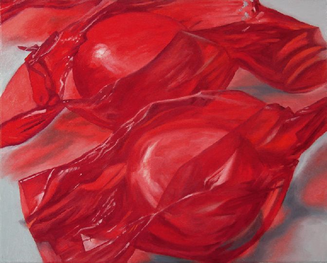 Red on Red by artist Douglas Newton: Oil painting of two red candies wrapped in cellophane. Gallery wrapped on heavy stretchers.