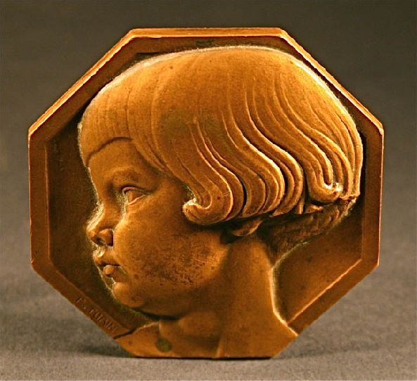 A wonderful and very rare bronze antique art medal featuring the head of a little Art Deco girl. This large medal, created in 1928 by artist P. Turin, showcases the girl's toys on the back. ...