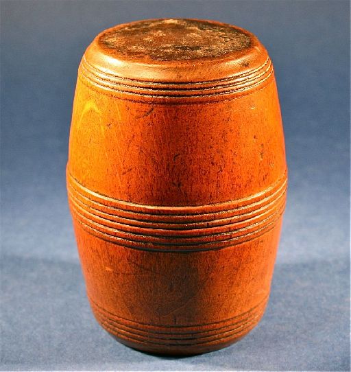 A very collectible little barrel shaped match striker box. The lid had a striker to the base at one time. The strike is on the underside in the form of a paper attached under the barrel. Thi...